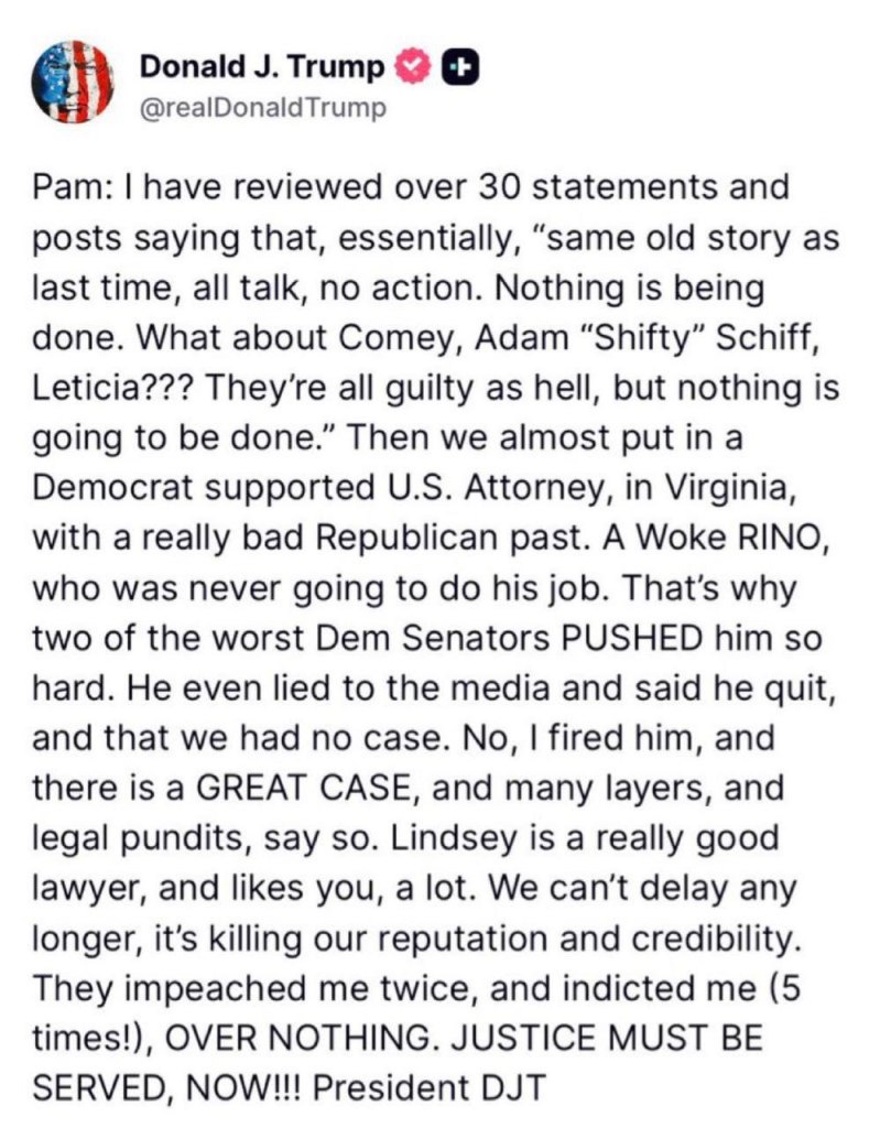 Ο Τραμπ στο μήνυμα που κοινοποίησε στην πλατφόρμα του Truth Social κατονόμασε τον διευθυντή του FBI Τζέιμς Κόμεϊ, τον γερουσιαστή Άνταμ Σιφ της Καλιφόρνια και την γενική εισαγγελέα της Νέας Υόρκης Λετίσια Τζέιμς, ισχυριζόμενος ότι «είναι όλοι απίστευτα ένοχοι».