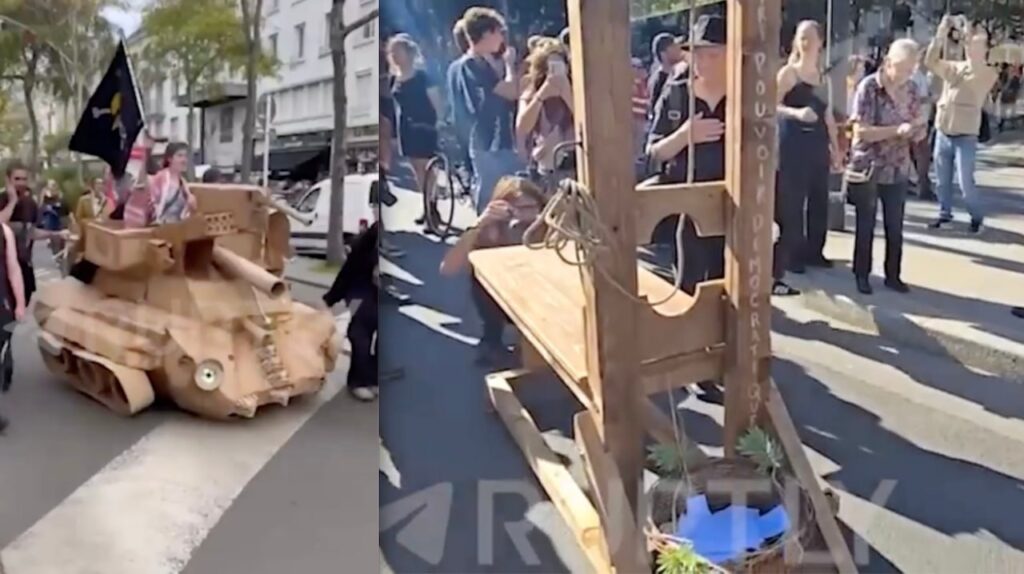 Στη Γαλλία οι βίαιες αντικυβερνητικές διαδηλώσεις συνεχίζονται σε όλη τη χώρα. Τώρα στους δρόμους εμφανίζονται πραγματικές γκιλοτίνες.