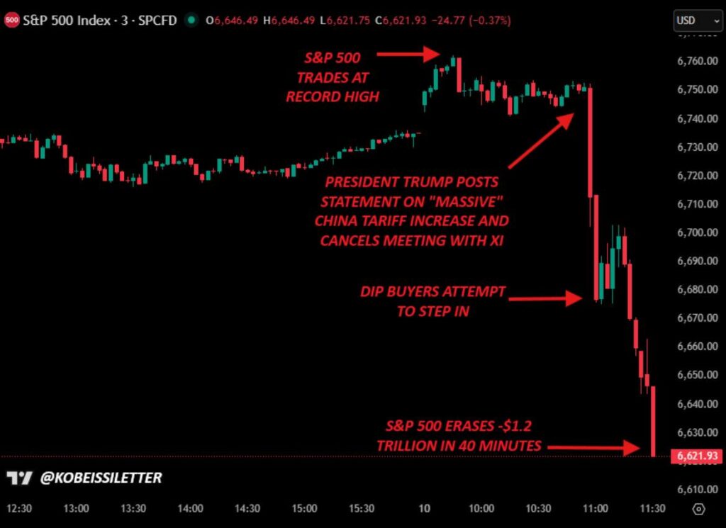 Μόλις έγινε γνωστό ότι η Κίνα υιοθέτησε μια εξαιρετικά επιθετική στάση στο εμπόριο, στέλνοντας μια εξαιρετικά εχθρική επιστολή προς τον κόσμο, δηλώνοντας ότι επρόκειτο, με ισχύ από την 1η Νοεμβρίου 2025, να επιβάλει μεγάλης κλίμακας ελέγχους εξαγωγών σχεδόν σε κάθε προϊόν που παράγει, και σε ορισμένα που δεν κατασκευάζονται καν από την ίδια… Οι Ηνωμένες Πολιτείες Αμερικής θα επιβάλουν δασμό 100% στην Κίνα, πέραν οποιουδήποτε δασμού που πληρώνουν αυτήν τη στιγμή. Επίσης, την 1η Νοεμβρίου, θα επιβάλουμε ελέγχους εξαγωγών σε οποιοδήποτε και όλα τα κρίσιμα λογισμικά.