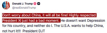 Μην ανησυχείτε για την Κίνα, όλα θα πάνε καλά. Ο σεβαστός Πρόεδρος Xi μόλις πέρασε μια κακή στιγμή. Δεν θέλει ύφεση για τη χώρα του, ούτε και εγώ. Οι ΗΠΑ θέλουν να βοηθήσουν την Κίνα, όχι να την βλάψουν!! Πρόεδρος DJT