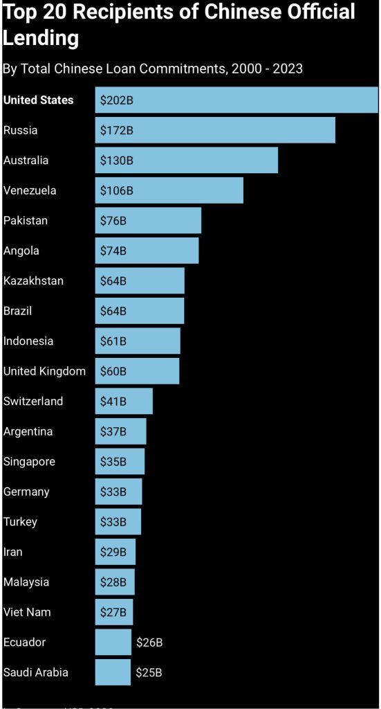 Η Κίνα ξεπερνά τη Δύση επειδή η Δύση καταστράφηκε από αυτούς τους ψεύτες . Αποδεικνύεται ότι ο δανεισμός της Κίνας προς διασυνοριακά κράτη είναι «δύο έως τέσσερις φορές μεγαλύτερος» από ό,τι είχε γίνει προηγουμένως αντιληπτό, σύμφωνα με τον Μπραντ Παρκς, εκτελεστικό διευθυντή της AidData. Ο δανεισμός της Κίνας σε 72 χώρες υψηλού εισοδήματος – σχεδόν 1 τρισεκατομμύριο δολάρια – είναι σε κλίμακα συγκρίσιμη με τον δανεισμό της Πρωτοβουλίας «Μία Ζώνη, Ένας Δρόμος». Οι ΗΠΑ είναι ο κορυφαίος αποδέκτης κινεζικού επίσημου δανεισμού.