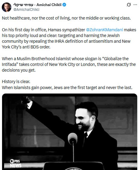 Επίσης, εξακολουθούν να προσπαθούν να προωθήσουν το σχεδιαζόμενο παιχνίδι αντιπαράθεσης μεταξύ Μουσουλμάνων και Χριστιανών. Ο Υπουργός Διασποράς του Ισραήλ επιτίθεται στον «συμπαθούντα της Χαμάς» δήμαρχο της Νέας Υόρκης, Ζόχραν Μαμντάνι. Ισχυρίζεται ότι ο δήμαρχος της Νέας Υόρκης ξεκαθάρισε ότι η «κορυφαία προτεραιότητά» του είναι να βλάψει τους Εβραίους. «Όταν οι Ισλαμιστές κερδίζουν την εξουσία, οι Εβραίοι είναι ο πρώτος στόχος και ποτέ ο τελευταίος».
