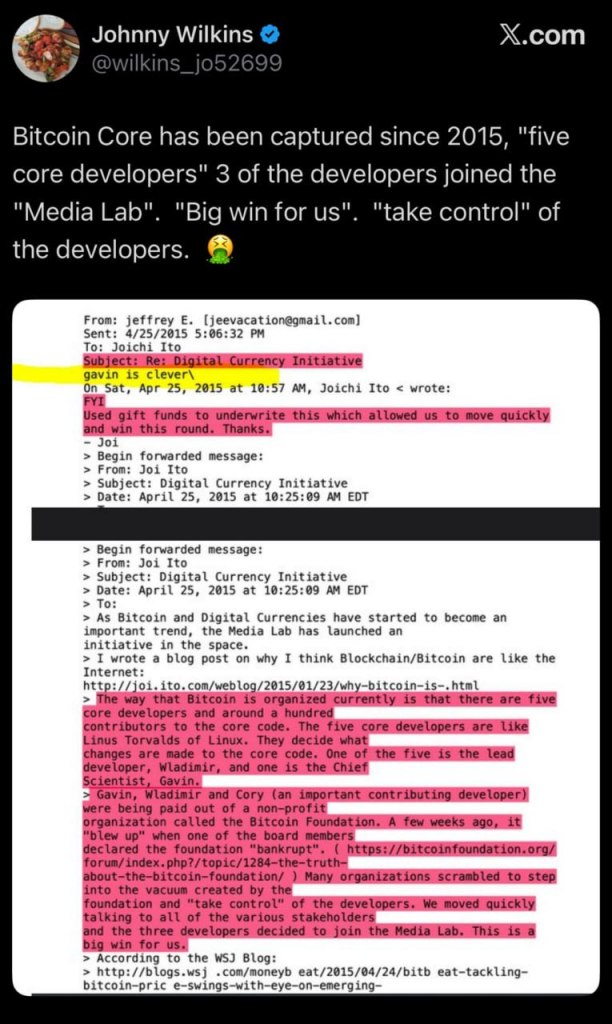 Το Bitcoin Core έχει καταγραφεί από το 2015, «πέντε βασικοί προγραμματιστές». 3 από τους προγραμματιστές εντάχθηκαν στο «Media Lab». «Μεγάλη νίκη για εμάς»