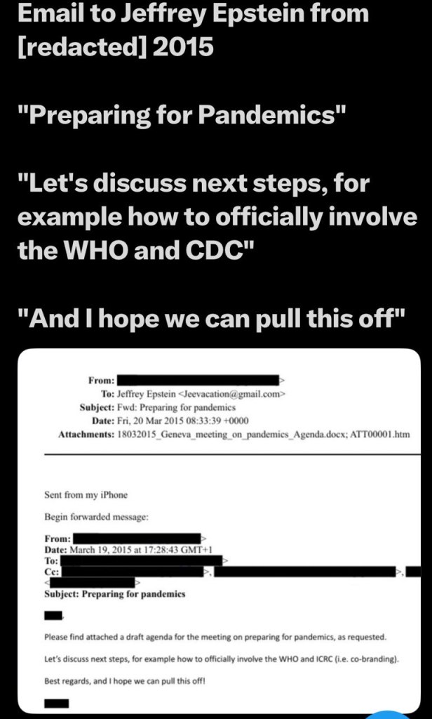 «Προετοιμασία για την πανδημία» το 2015, «Ας συζητήσουμε τα επόμενα βήματα, για παράδειγμα, πώς να εμπλέξουμε επίσημα τον ΠΟΥ και το CDC». «Ελπίζω να μπορέσουμε να το πετύχουμε». Ο Γκέιτς σχεδίαζε την πλανδημία με τον Έπσταϊν, τον ΠΟΥ και το CDC το 2015. Διόλου παράξενο που έβγαλε τόσα πολλά χρήματα από τα «εμβόλια».