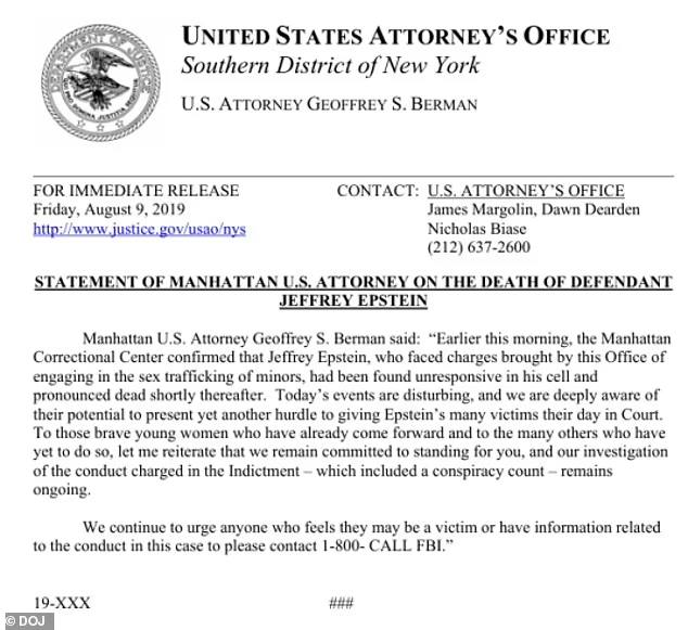 Η ομοσπονδιακή δήλωση στα αρχεία του Έπσταϊν αναφέρει ότι ο Έπσταϊν είχε ήδη κηρυχθεί νεκρός στις 9 Αυγούστου, σε αντίθεση με το επίσημο χρονοδιάγραμμα που σηματοδοτεί τον θάνατό του στις 10 Αυγούστου.