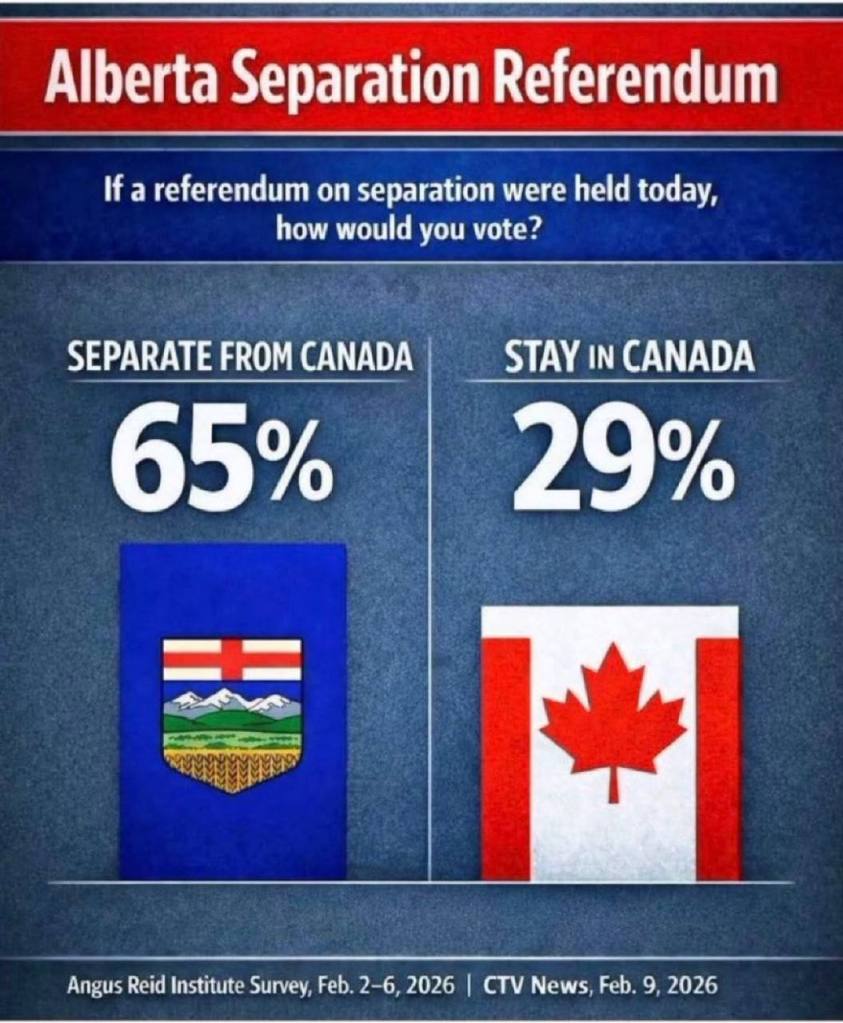 Επίσης, αν δεν αναλάβει δράση, ο Καναδάς θα διαλυθεί. Οι δημοσκοπήσεις δείχνουν ότι η πλειοψηφία των κατοίκων της Αλμπέρτα είναι πλέον έτοιμη να διασώσει τον Καναδά.