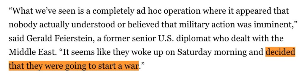 «Αυτό που βλέπουμε είναι μια επιχείρηση στημένη επί τούτου, όπου φαίνεται κανείς να μην καταλάβαινε ή πίστευε πραγματικά πως επίκειται στρατιωτική δράση» ανέφερε ο Στρατηγός Φάιερστάιν, πρώην ανώτερος διπλωμάτης ΗΠΑ ο οποίος έχει δραστηριοποιηθεί στη Μέση Ανατολή. «Φαίνεται σαν να ξύπνησαν το Σάββατο το πρωί και αποφάσισαν να ξεκινήσουν έναν πόλεμο.»